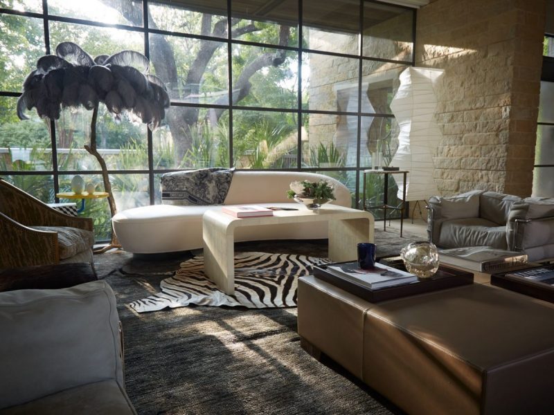 In the living room, the center stage of this home, there’s a Vladimir Kagan sofa that’s upholstered in a creamy Rogers & Goffigon linen that offsets the living room’s darker elements, while a vintage ostrich-feather floor lamp and zebra-hide rug. This Dallas Home couldn’t be complete without a Noguchi floor lamp, a travertine cocktail table by Ironies, and an ottoman by Liaigre.