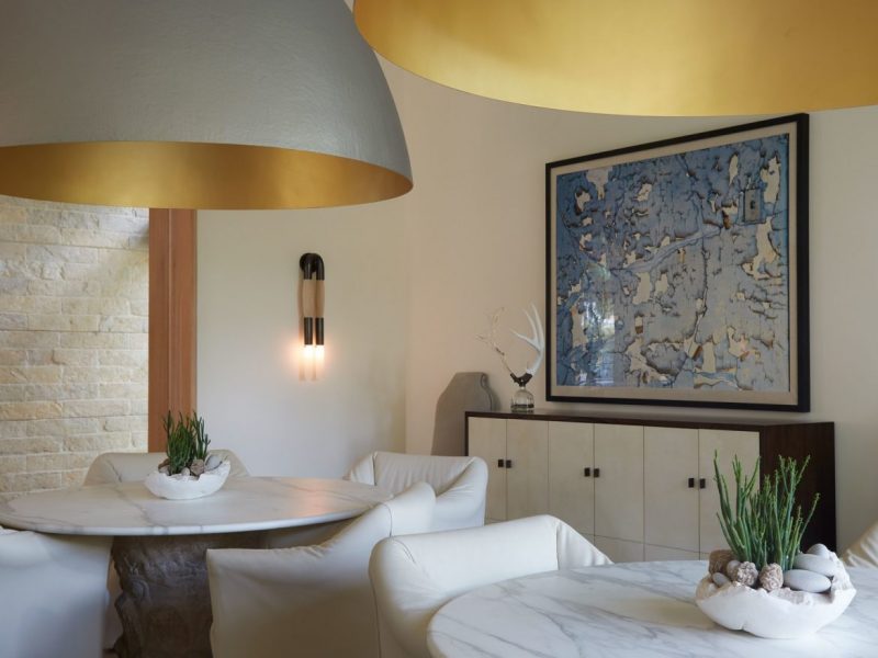 Throughout this amazing and modern home, there are a pair of gold dome lights by Ingo Maurer that hang above two small Formations tables instead of a traditional rectangular table in the dining room. The chairs are by Cassina, the sconce is by Apparatus Studio, and the sideboard is by Holly Hunt.