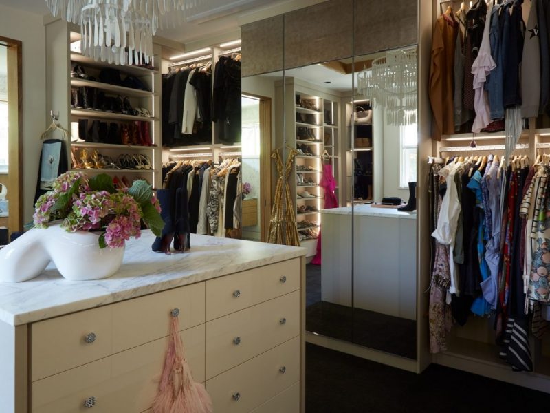 To include in this Dallas Home, it had to have a 280-square-foot addition allowed the homeowner to build a space to house her impressive wardrobe with help from California Closets. The design of this closet is absolutely embellished through a chandelier by Fisher Weisman, mirrored and gold-leaf storage, and a black carpet.