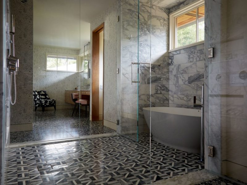 In the spacious master bathroom, it stands out the pairs of geometric Ann Sacks and arabescato marble tiles in the shower area, while the vanity area blends terrazzo flooring with a graphic Pierre Frey wall covering. There also two Pierre Counot Blandin chairs are upholstered in Pierre Frey fabric and Pavoni leather.