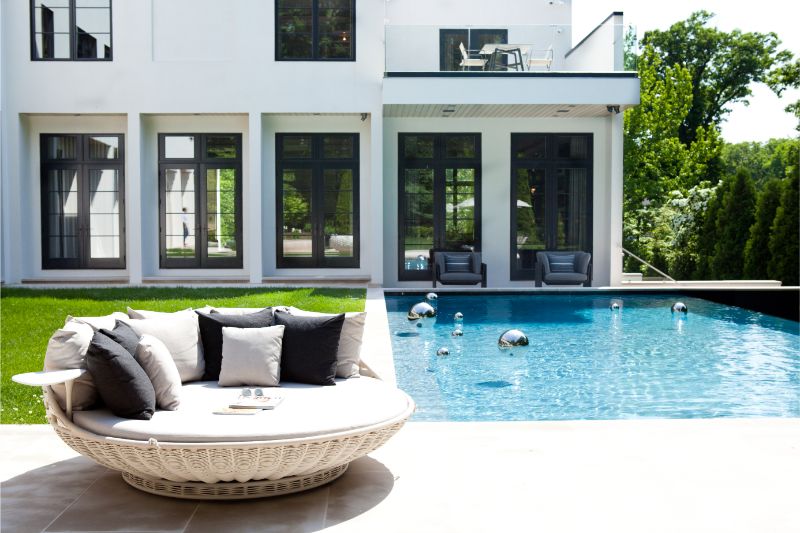 In this interior design project that sensibility can be seen in the bright family room, where caterpillar-like Togo sofas by Michel Ducaroy for Ligne Roset are covered in a charcoal and white fabric from Donghia that gives the appearance of stone—an allusion that’s mirrored in the mineral pattern of the custom Tibetano rug. The connection to nature is enhanced via a link to the outdoors through a limestone-clad loggia, which can be enclosed with mesh screens and heated for indoor-outdoor living in the fall.