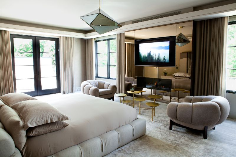 The kitchen design is a similar study in taupe, accented by high-gloss cabinetry, striated stone surfaces and amber lighting by Studio Van den Akker. The chrome-and-leather Arete bucket chairs are another subtle ’70s reference—a nod to Danielle’s fondness for interiors from James Bond movies of that period—also seen in the vintage Pierre Paulin chair in her teenage son’s bedroom. Throughout, the pervading sense is one of warmth.