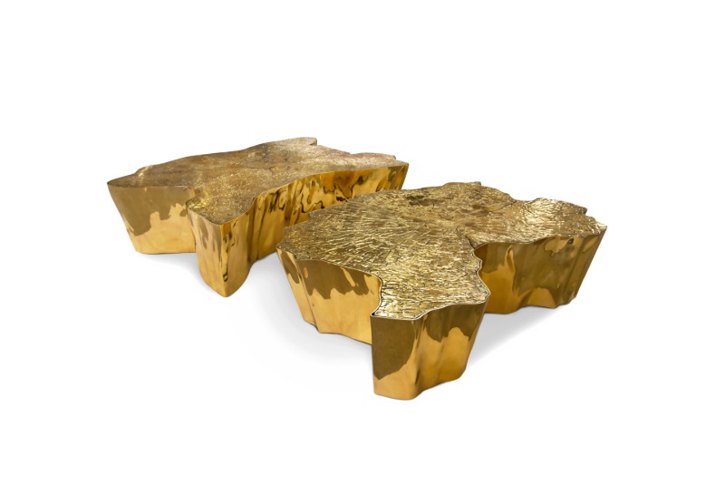 That philosophy is evident in the elegant gentleman’s den with a moody charcoal palette, where tree trunk–shaped brass-covered center tables by Boca Do Lobo and a grey onyx bar offer an earthy contrast to a sartorial tufted A. Rudin sofa covered in lustrous, metallic fabric.